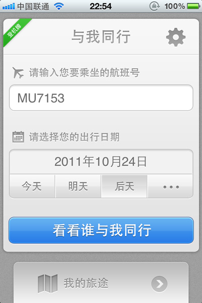 与我同行是一款基于航班同乘的手机交友应用,定位细分市场——同“乘”交友。