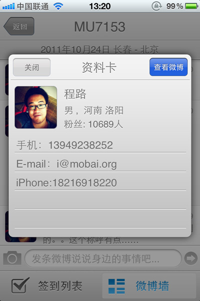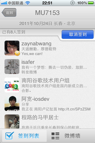 用户绑定新浪微博,输入自己的航班号和出行日期并点击“查看谁与我同行”按钮即可查看同乘人列表。“签到”后,可以浏览同乘的个人信息(自定义的联系方式和微博地址),同时可浏览微博墙(即:本航班签到的所有同乘朋友的最新五条微博列表),也可以在微博墙里发布新微博,@好友进行交流。